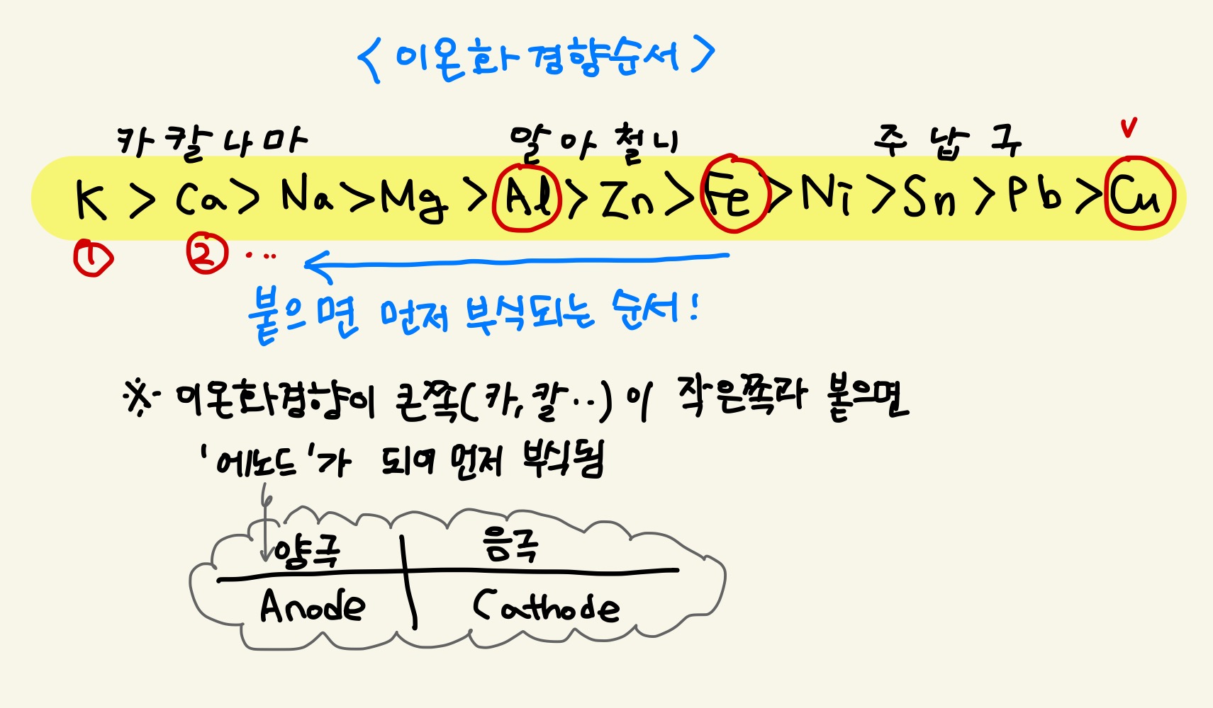 아래 그림은 이온화 경향 순서입니다.