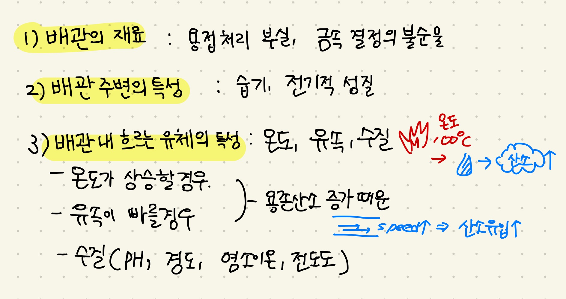 크게는 배관의 재료, 배관 주변의 특성, 흐르는 유체의 특성 이 세 가지로 구분할 수 있습니다.