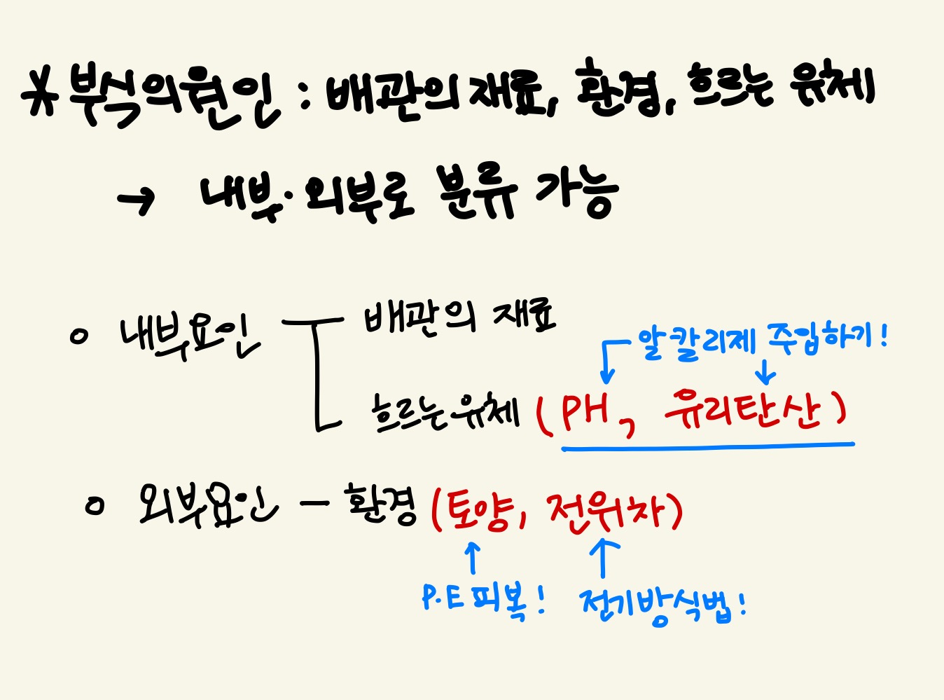 흐르는 물이(유체가) 산성을 띄어 산화작용이 생기거나, 잔류염소가 많거나, 유리탄산이 많다면 부식이 되기 쉽습니다.