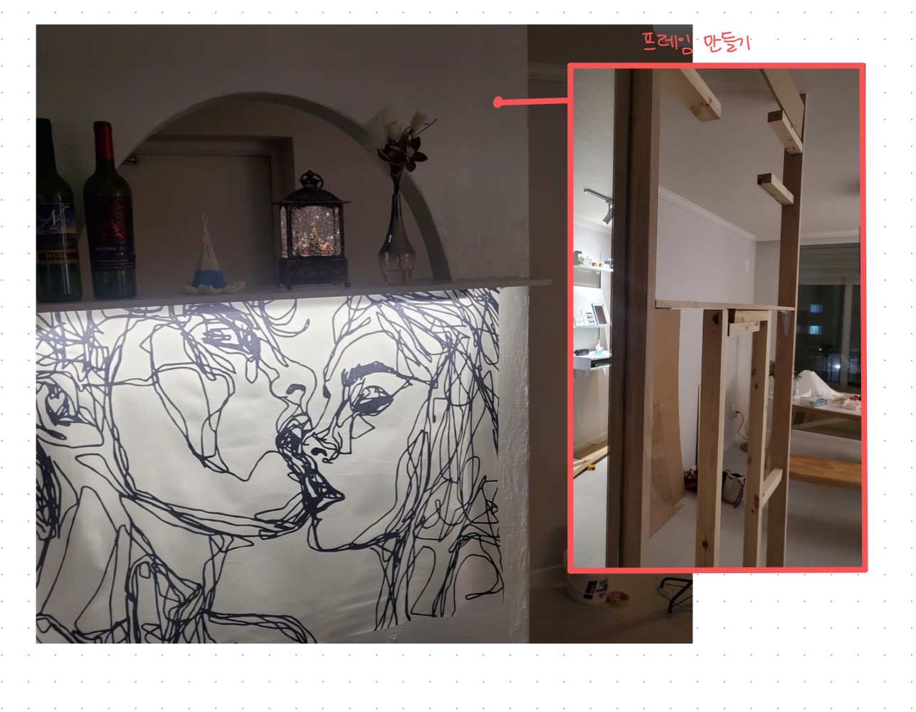 이번글에서는 아치형 모양을 내는 방법과 기본틀을 간편하게 잡는 방법에 대해 자세하게 풀어보겠습니다. 보통 프레임을 설치하는 단계에서는 기본자재들(프레임을 포함한 합판까지)이 재단돼 있는 상태여야 합니다.