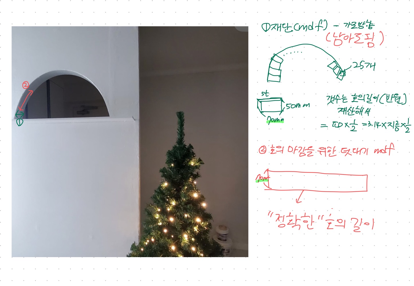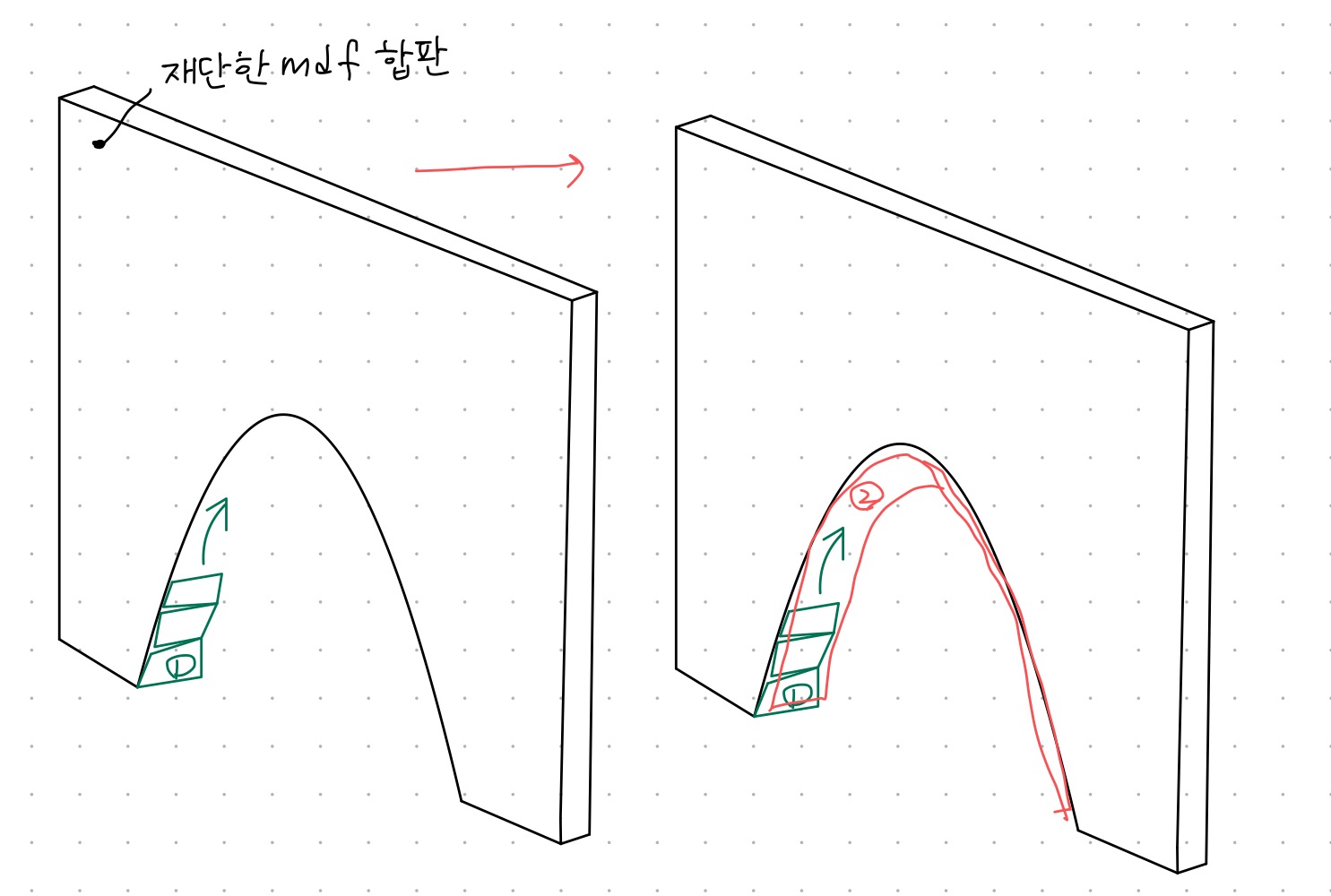 이런 식으로 먼저 재단한 mdf합판> 1번 가로목재 붙이기 > 2번 세로목재 붙이기 하면 아치형 틀 끝!