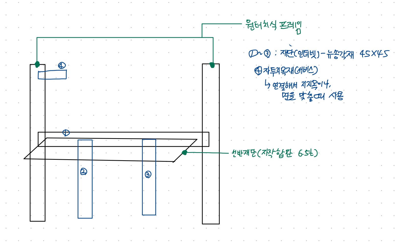 1번 각목으로 네 기둥을 잡아주고, 그 사이사이에 4번 자투리목재로 가로방향 힘을 잡아주었습니다.