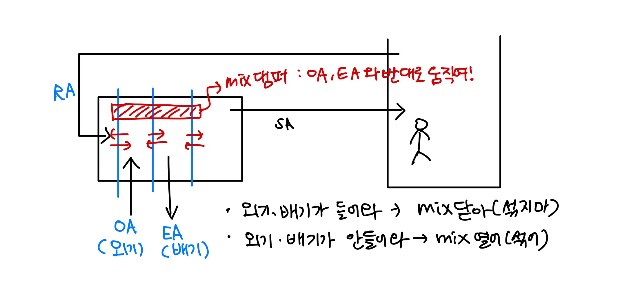 믹스댐퍼가 닫고 외기배기가 열리는 것은 반대의 경우라고 보면 됩니다.