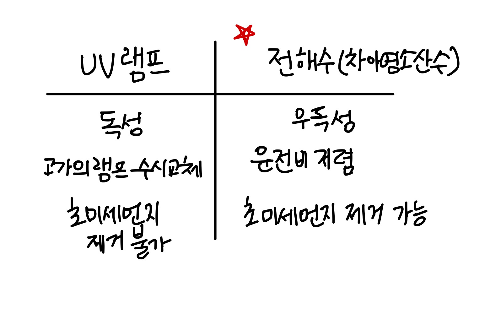 전해수를 이용한 살균방식이 uv램프에 비해 독성도 없고, 운영비도 저렴하며, 초미세먼지를 제거하는 기능까지 가능합니다.