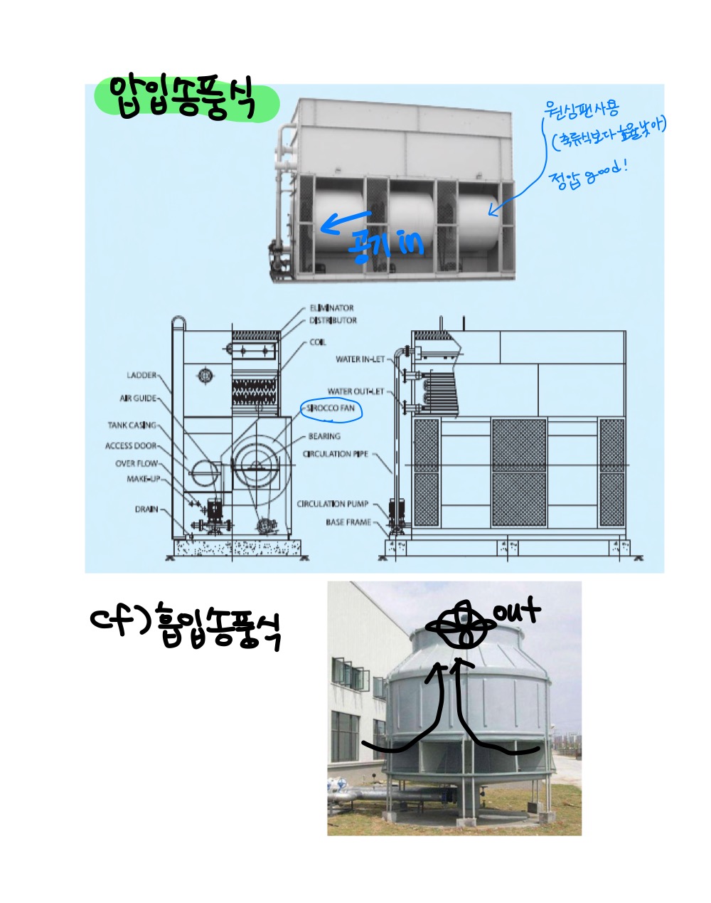위의 그림은 압입송풍식 냉각탑과 흡입송풍식 냉각탑입니다.