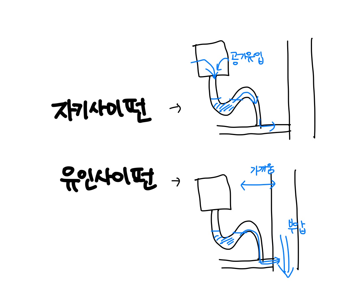 사이펀작용은 또 두 가지로 분류되는데, 만수 된 물이 일시에 흐르는 자기 사이펀과, 수직관 가까이에 봉수가 설치되어 부압으로 내려가버리는 유인사이펀이 있습니다.