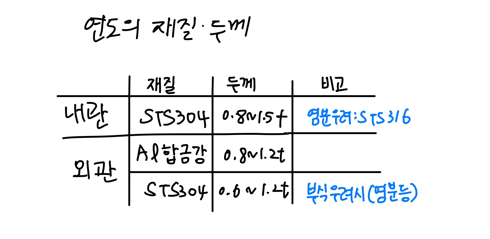 설계 시에 재료를 검토하게 되는데, 내관은 보통 sts304 재질, 외관은 비용을 고려하여 al합금강판을 적용합니다.