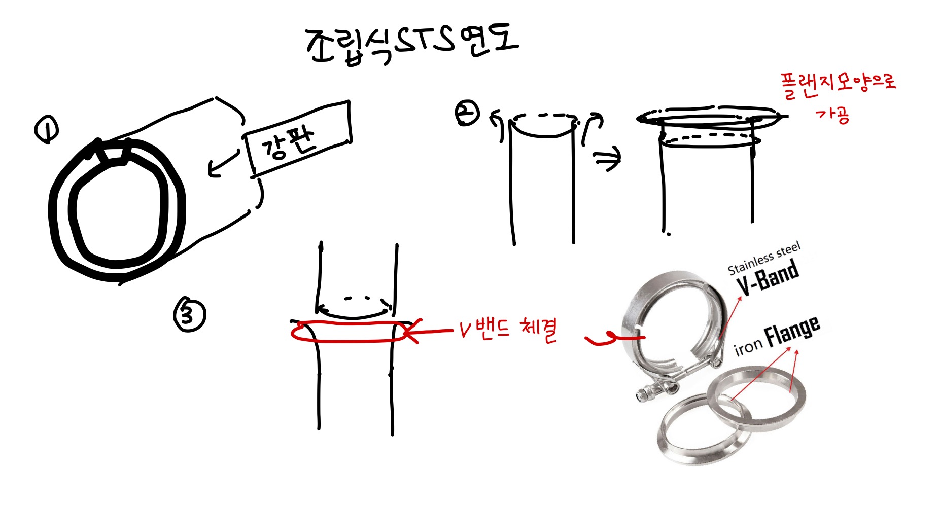 이후 다른 연도의 끝부분과, 플랜지모양으로 접은(확관 한) 이 부분을 끼워 v밴드로 체결하는 과정을 통해 제작시공됩니다.