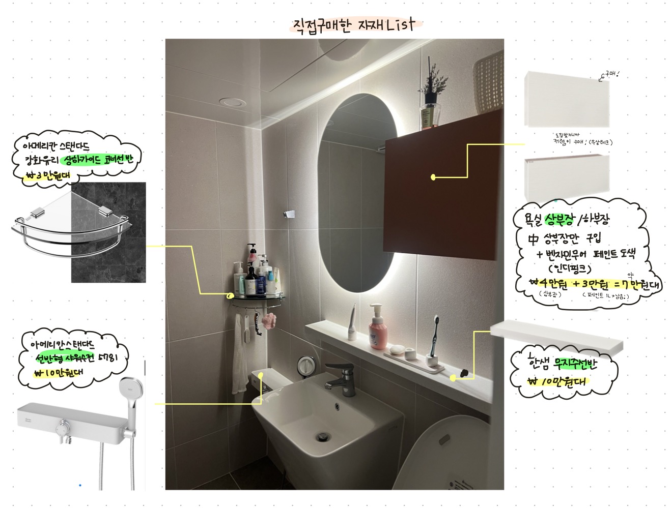 일부 자재를 따로 구매한 이유는 쓰고 싶었던 샤워 수전(아메리칸스탠다드 제품)과 무지주선반(한샘 제품인데 실제로 보니 펄감 있고 고급스러운 느낌)때문이었습니다.