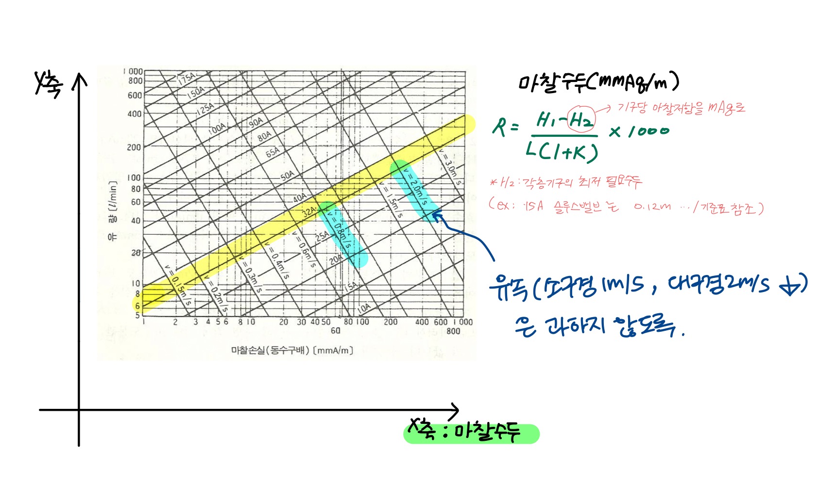 마찰수두를 위 공식을 통해 얻어내고, 이 마찰손실을 마찰저항선도 그래프의 x축에 대입합니다.