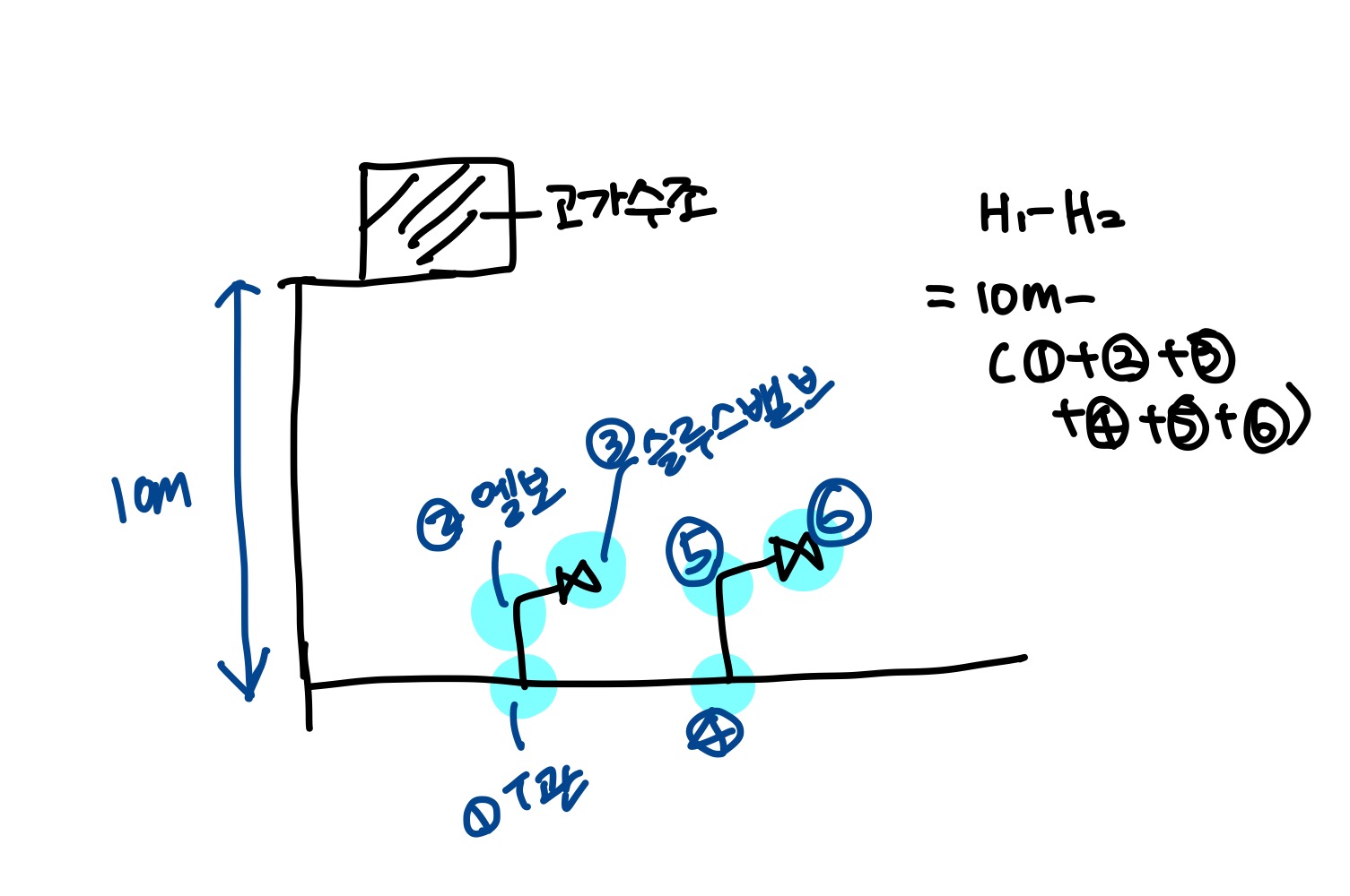 그림에서는 엘보, t관, 슬루스밸브 등 6포인트가 있으므로 1~6번까지의 환산한 m를 모두 더하면 됩니다.